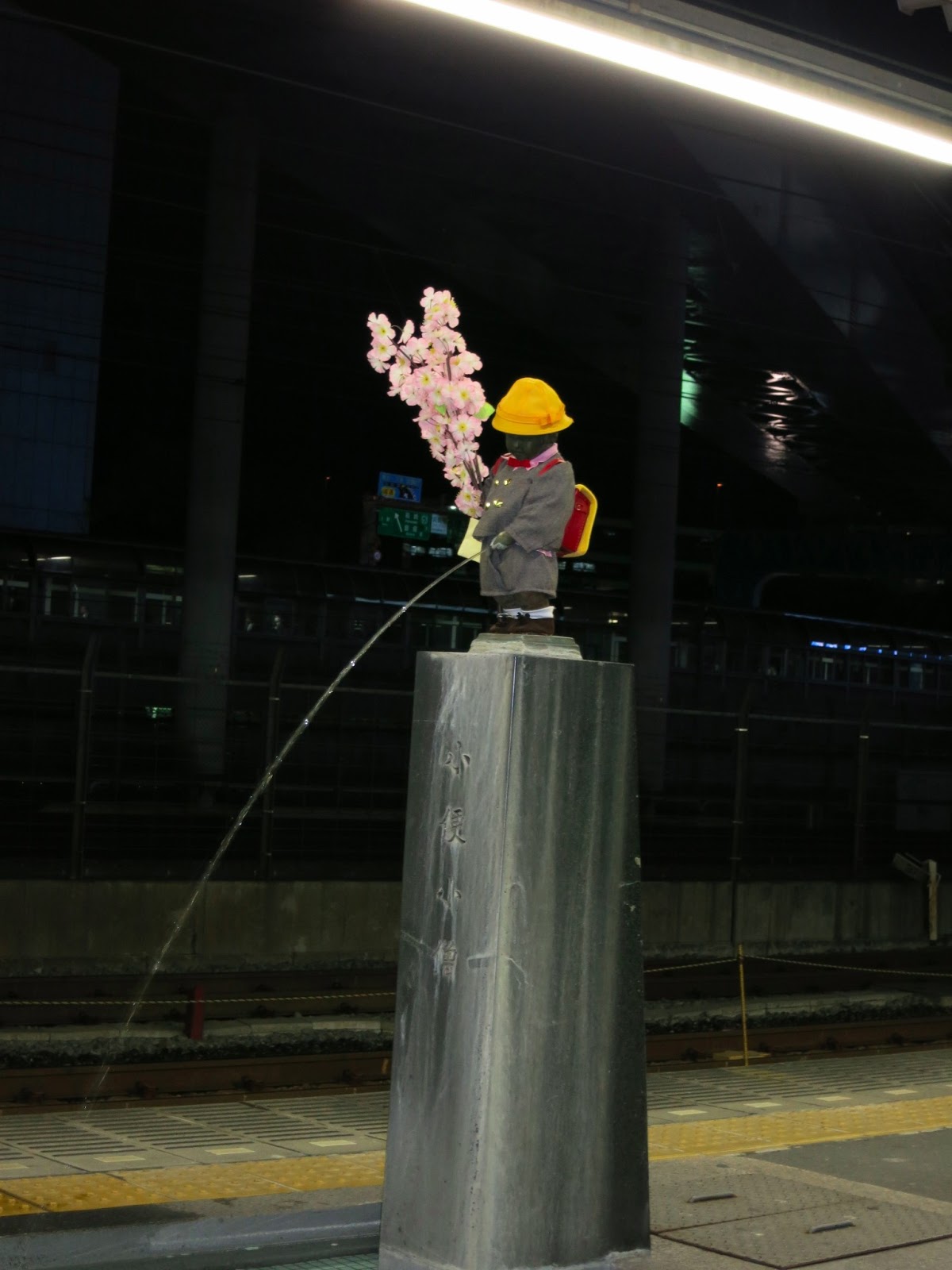 | There is a Manneken Pis on some random train platform. |